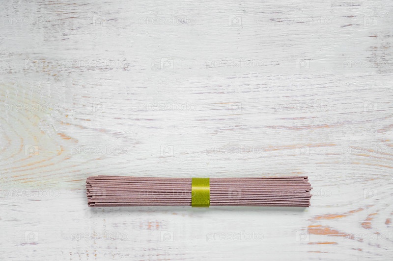 Сырая лапша соба на белом деревянном столе. Традиционная японская еда. Вид сверху