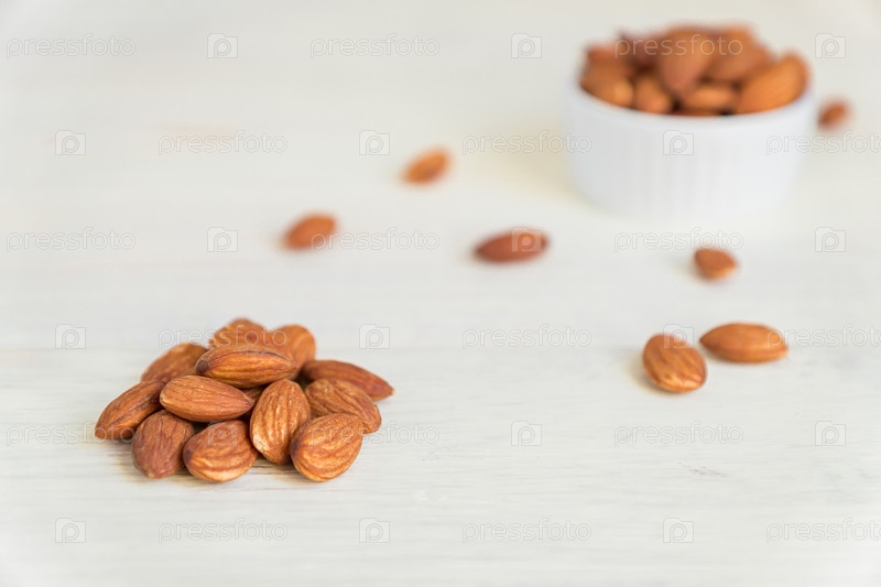 Куча жареного миндаля на белом деревянном столе, крупным планом, пространство для копирования