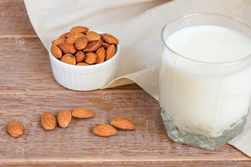 Домашнее миндальное молоко в стакане и орехи в белой фарфоровой миске на деревянном фоне