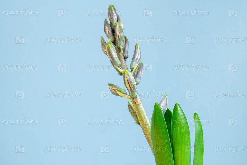 Синий цветок гиацинта закрыл бутон в зеленом транспортном горшке на синем фоне. Скопируйте пространство