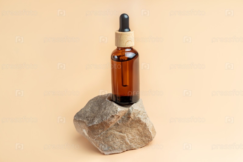 Косметическая бутылка из темного стекла с капельницей на бежевом фоне с камнем и копией пространства. Концепция натуральной косметики, натуральные эфирные масла и средства по уходу за кожей. Макет