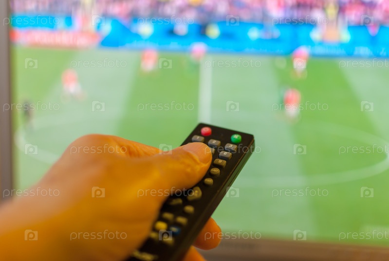 Рука держит пульт дистанционного управления телевизором против размытого экрана, на котором транслируется футбол