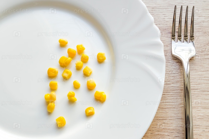 Крупный план сладкой кукурузы и стальной вилки в белой тарелке на деревянном столе