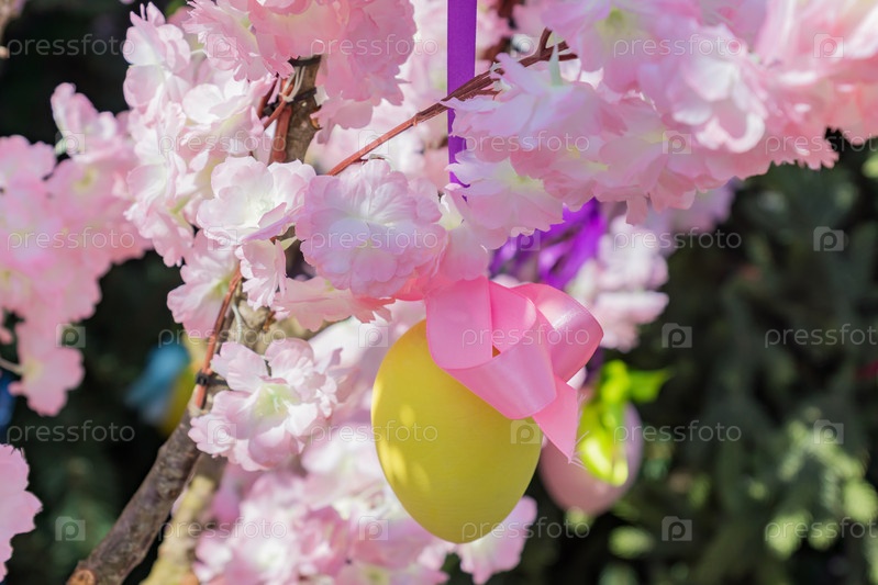 Желтое пасхальное яйцо висит на цветущей ветке яблони. Пасхальное украшение и концепция празднования