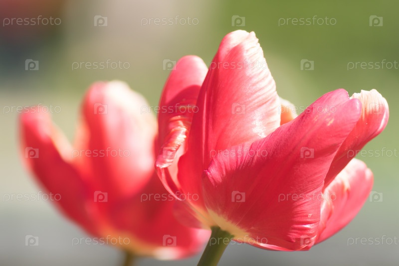 Крупным планом цветущий розовый тюльпан. Цветочный фон. Пейзаж летнего сада. Мягкий фокус