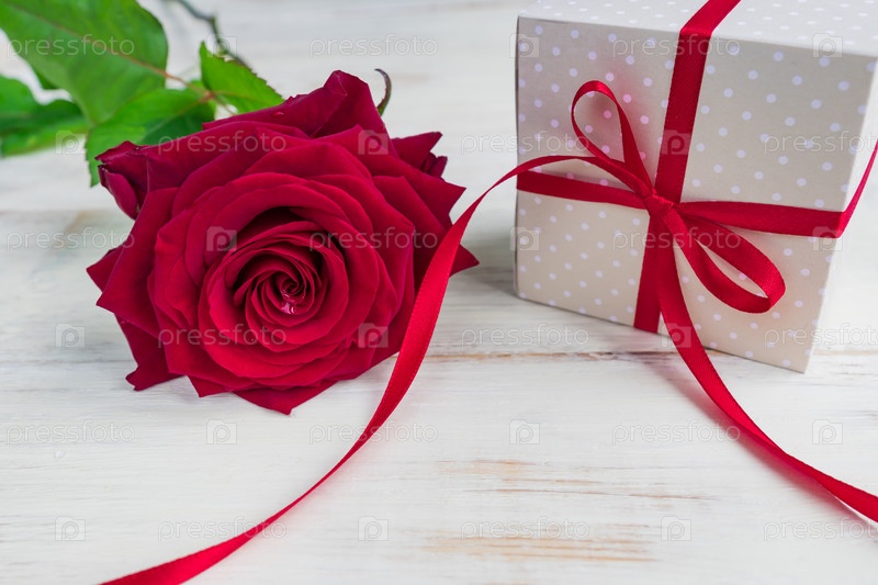 Бежевая подарочная коробка в горошек с бантом из красной ленты и красивыми красными розами на деревянном фоне. Открытка к празднику