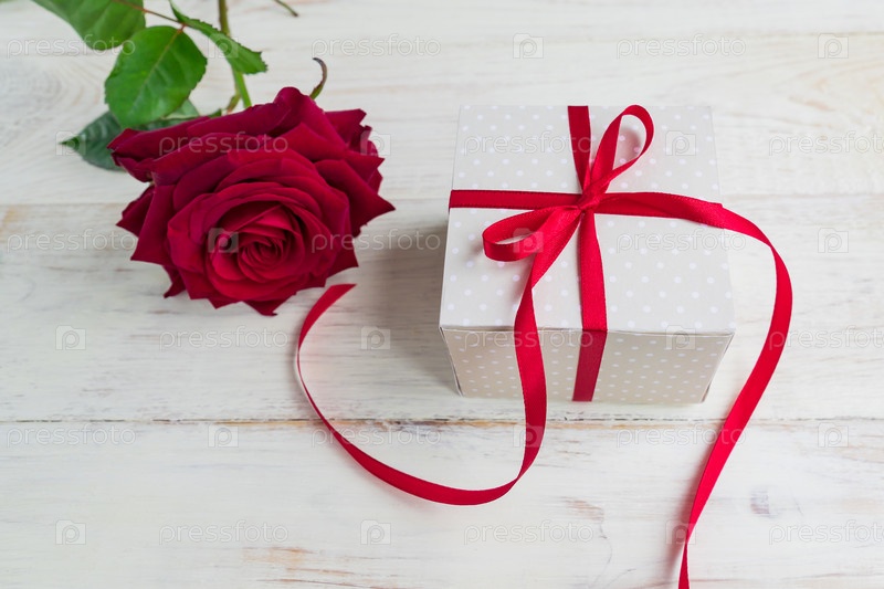 Бежевая подарочная коробка в горошек с бантом из красной ленты и красивыми красными розами на деревянном фоне. Открытка к празднику