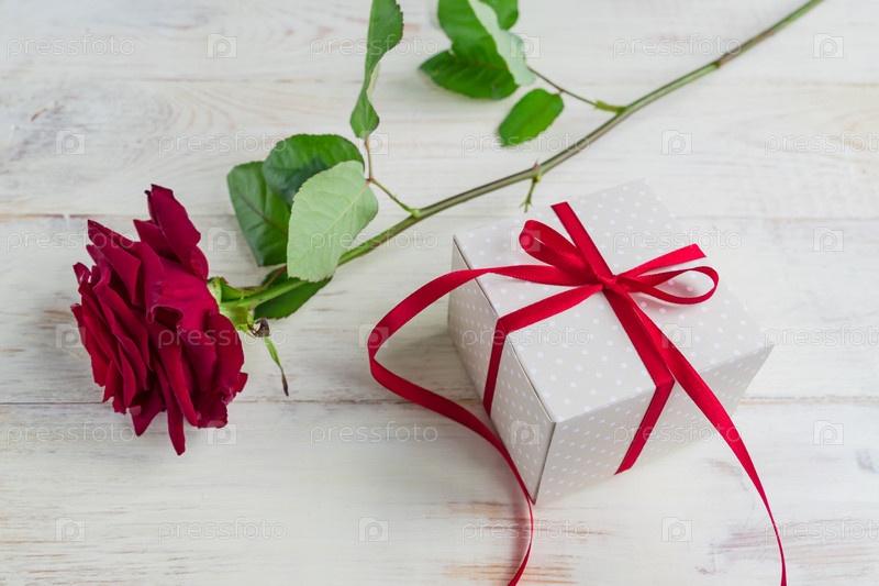 Бежевая подарочная коробка в горошек с бантом из красной ленты и красивыми красными розами на деревянном фоне. Открытка к празднику