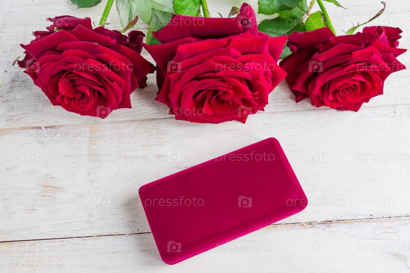 Подарочная коробка ювелирных изделий и красивые красные розы на деревянном фоне