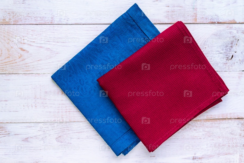 Вид сверху на тканевые салфетки синего и бордового цветов на деревенском белом фоне. Скопируйте место для текста