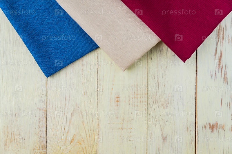 Вид сверху на тканевые салфетки бежевого, синего и бордового цветов на деревенском белом фоне