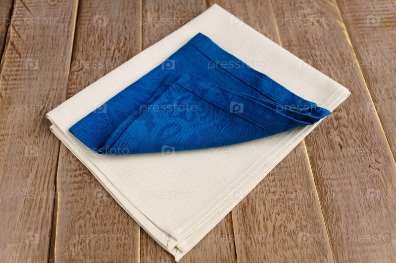 Закройте тканевые салфетки бежевого и синего цветов на деревенском деревянном фоне