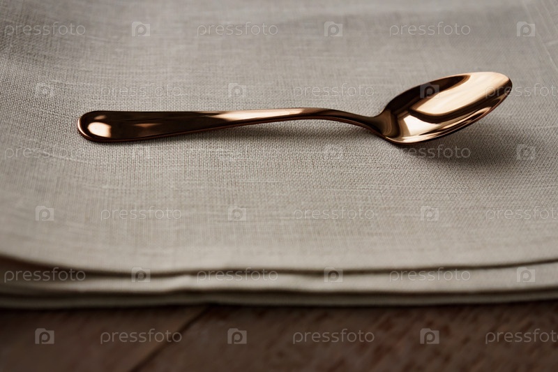 Закройте тканевую салфетку бежевого цвета и подайте чайную ложку на деревянном столе