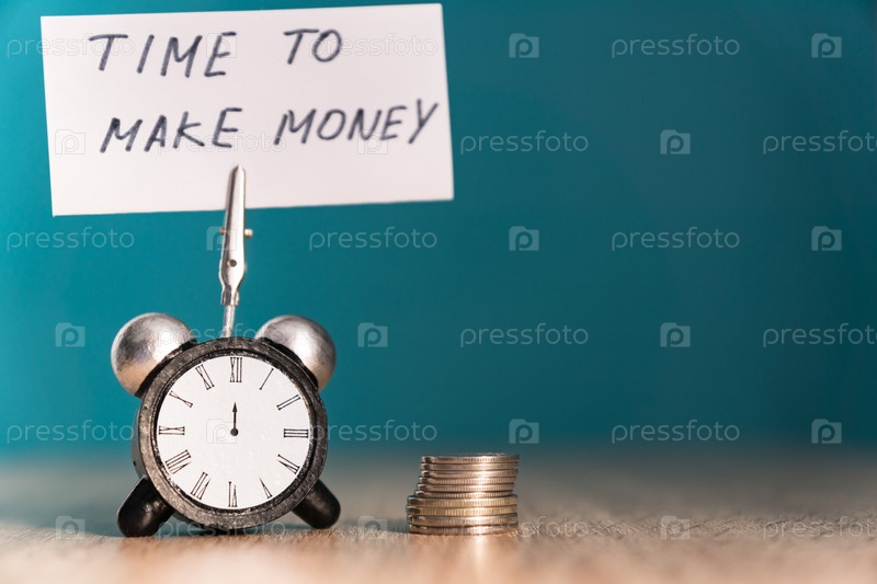 Будильник и баннер с рукописной фразой "время зарабатывать деньги" на деревянном столе. концепция бизнеса