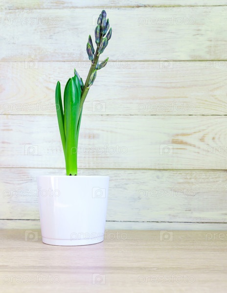 Голубой цветок гиацинта закрыл бутон в белом керамическом горшке на деревянном фоне. Скопируйте пространство