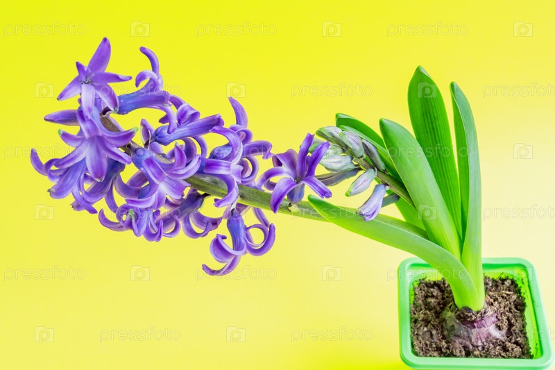 Цветущий голубой гиацинт в зеленом пластиковом горшке на желтом фоне. Скопируйте пространство
