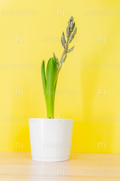 Голубой цветок гиацинта закрыл бутон в белом керамическом горшке на желтом фоне. Скопируйте пространство