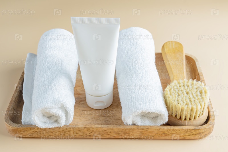 Массажная щетка с натуральной щетиной для чистки тела, полотенце и скраб для тела на деревянном подносе. натуральная щетина для устранения целлюлита и стимуляции лимфатической системы. Инструменты для спа