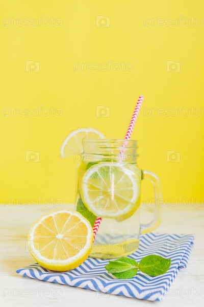 Цитрусовая лимонадная вода с нарезанным лимоном и мятой, здоровый и детокс-водяной напиток летом на желтом фоне. Летний яркий фон с копией пространства