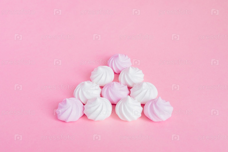 Белые и розовые скрученные безе в форме пирамиды на розовом фоне, поздравительная открытка, копия пространства