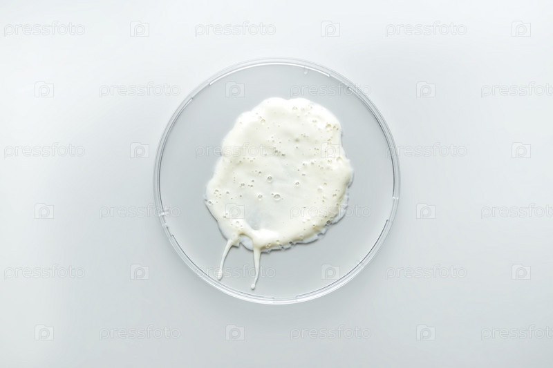 Белая косметическая текстура пены для очищения лица в чашке Петри. Мазок лосьона на сером фоне. Образец косметического средства по уходу за кожей. сливочное пятно