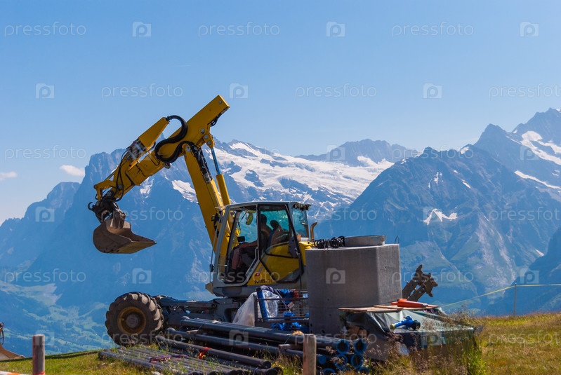 Желтый экскаватор на фоне Альп, Гриндельвальд, Швейцария