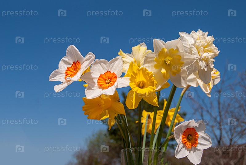 Букет разных цветов Нарцисса в солнечный весенний день на фоне голубого неба