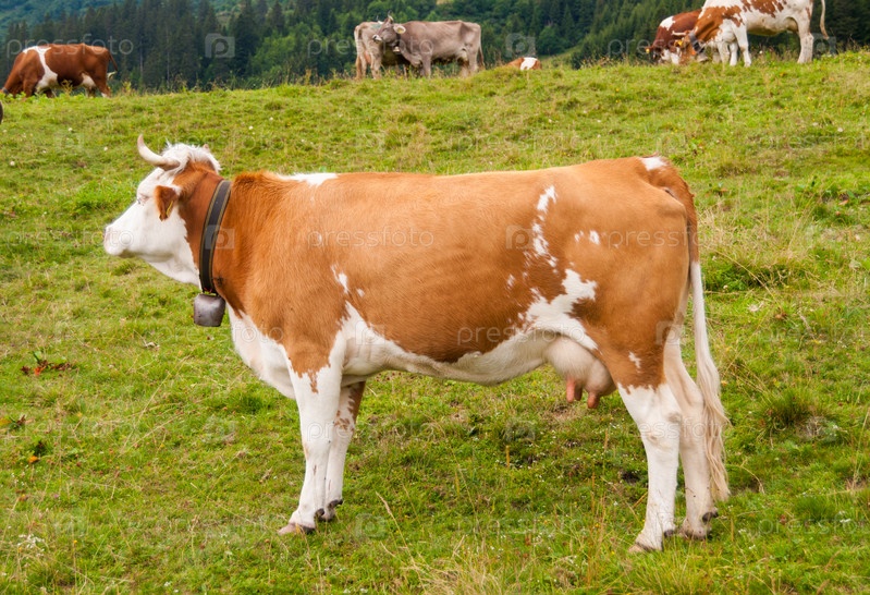 Крупный план коров, пасущихся на зеленом лугу Швейцарских Альп