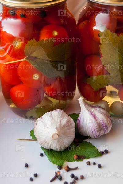 Консервированные помидоры в стеклянной банке, чеснок и приправы