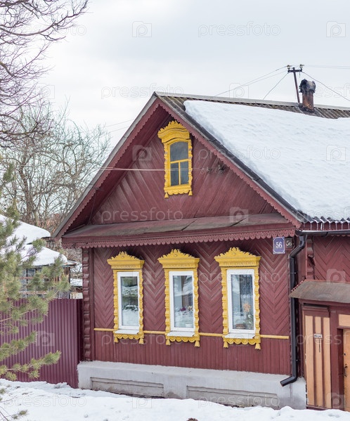 Одноэтажный старый деревянный дом в маленьком провинциальном городке. традиционная отделка, резные ставни
