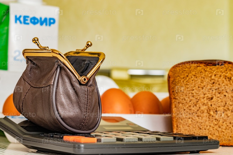 Бумажник, калькулятор, продукты. концепция расчета ежедневных расходов