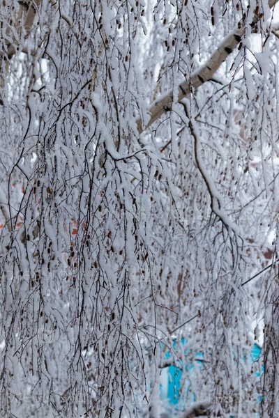 Зимний пейзаж с покрытыми инеем ветвями берез