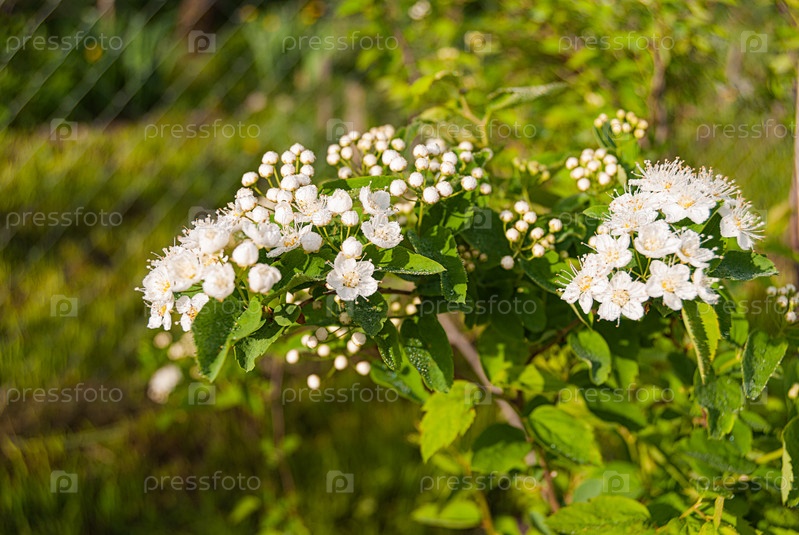 Цветы Spiraea vanhouttei цветут в солнечный день с капельками росы