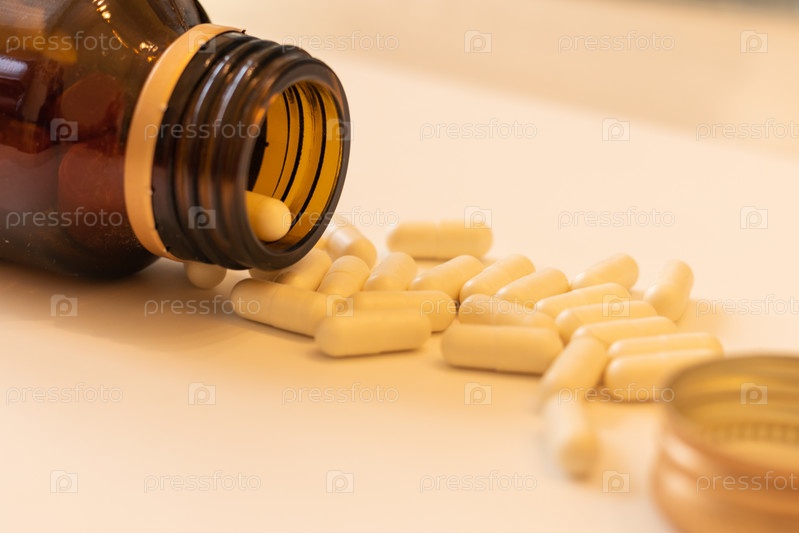 Крупный план разбросанных капсул с лекарствами на поверхности стола