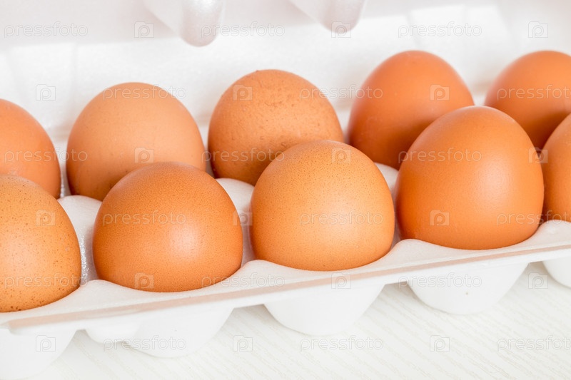Куриные яйца в пластиковой упаковке на столе. крупным планом