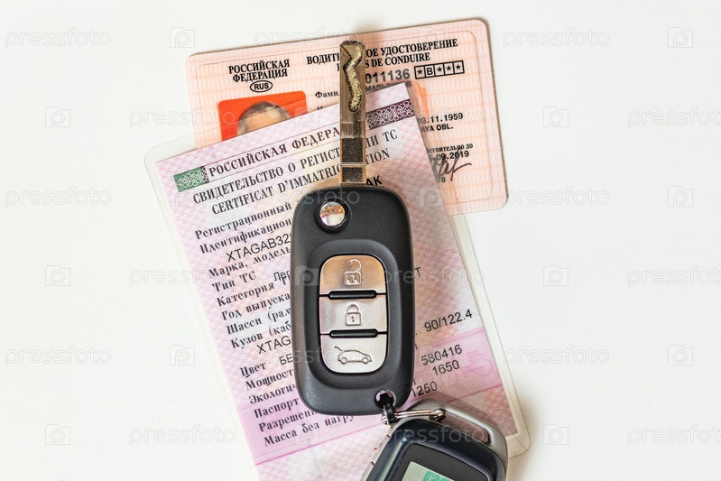 Вид сверху. свидетельство о регистрации автомобиля, водительское удостоверение и ключи от машины