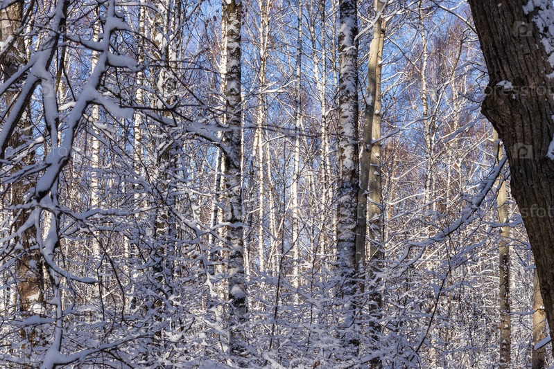 Зимний пейзаж. Заснеженный лес в солнечный морозный день