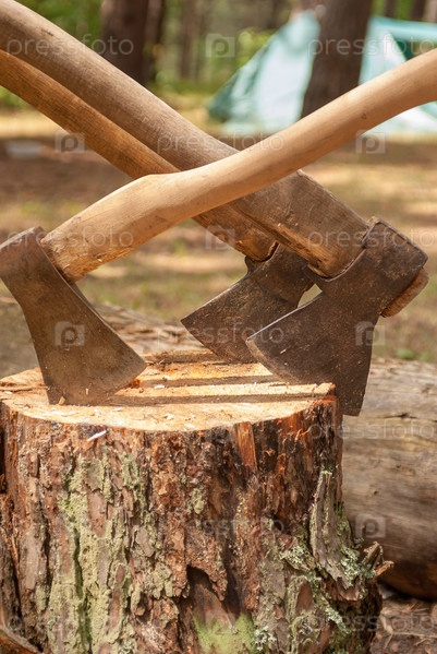 Три топора застряли в пне крупным планом