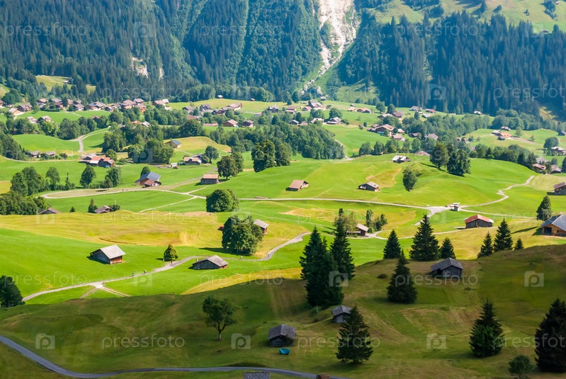 Пейзаж с горной деревней летом, Гриндельвальд, Швейцария