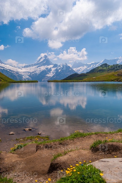 Отличный вид на скалистые горы Популярная туристическая достопримечательность Местонахождение Bachalpsee в швейцарских Альпах, долина Гриндельвальд, Бернский Оберланд, Европа
