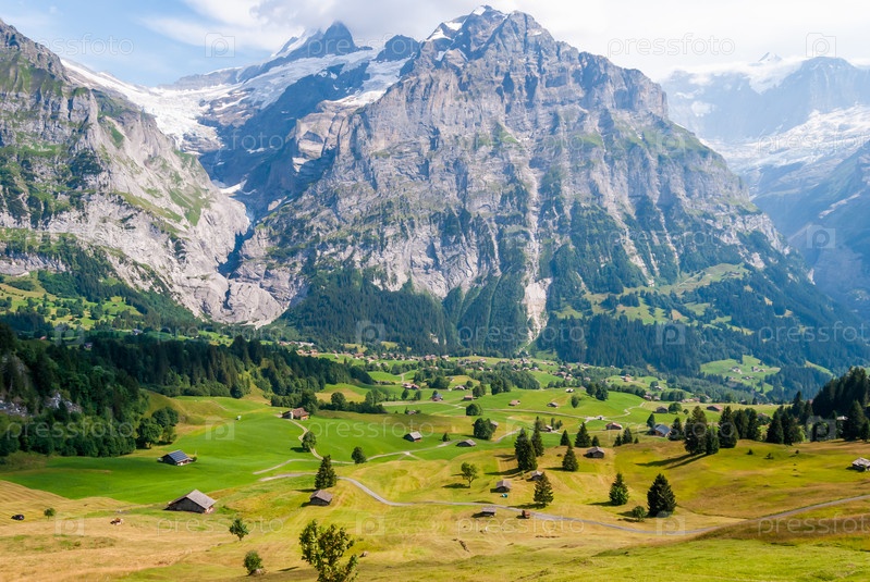 Пейзаж с горной деревней летом, Гриндельвальд, Швейцария