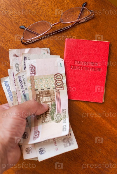 Мужская рука держит деньги, очки и пенсионное удостоверение на деревянной поверхности-английский перевод: пенсионное удостоверение