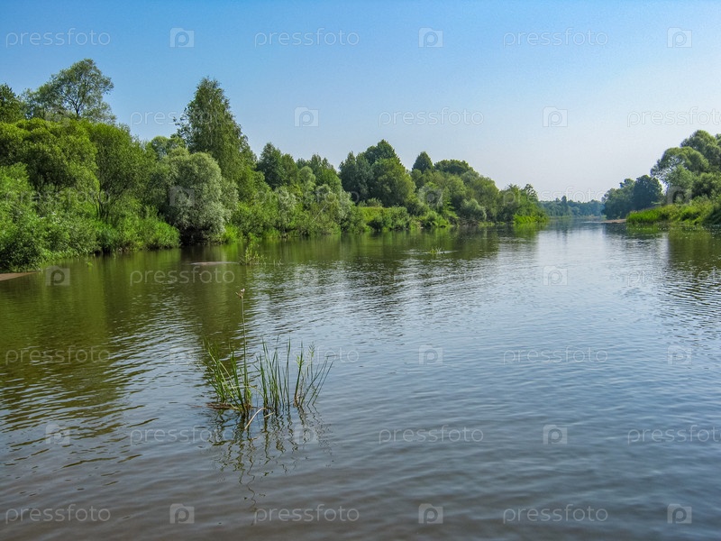 Солнечный летний пейзаж с рекой. Река в Калужской области России. тихий солнечный день. Спокойствие. Безоблачное голубое небо