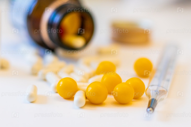 Термометр и таблетки от гриппа и простуды. крупным планом