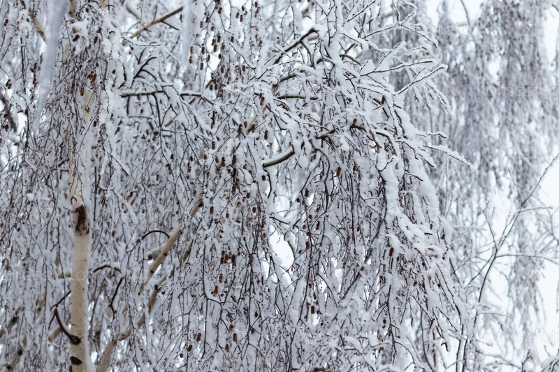 Зимний пейзаж с покрытыми инеем ветвями берез