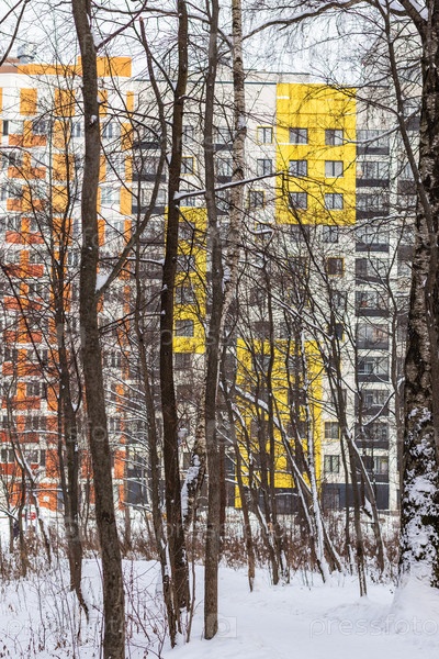Современный многоквартирный дом с красочными фасадами на окраине города. Москва, Россия
