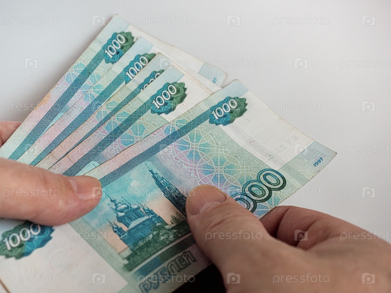 Русские купюры в тысячу рублей в руках мужчин