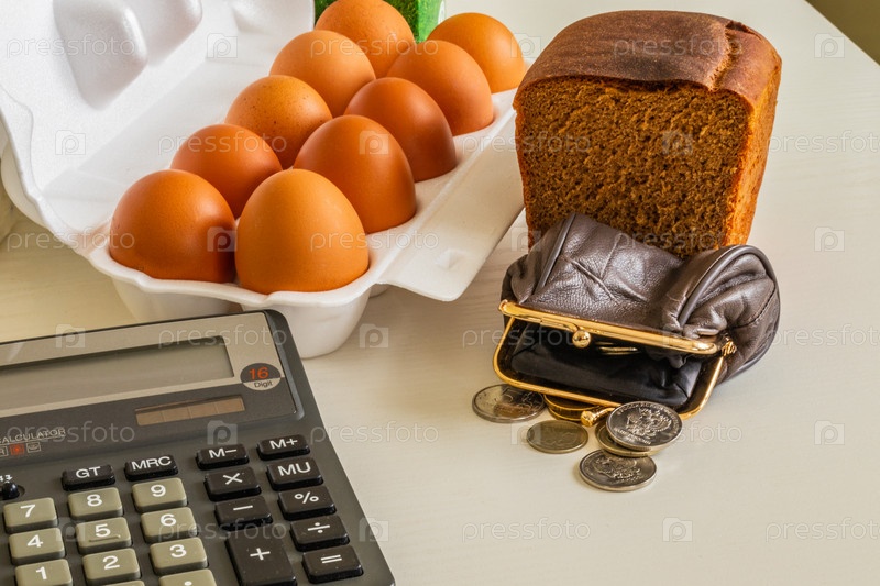 Бумажник, калькулятор, продукты. концепция расчета ежедневных расходов