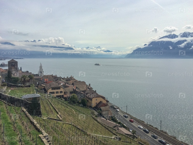 Пейзаж весной, вид на виноградники региона Лаво над озером Леманн - Женевское озеро - с французскими Альпами, голубым небом и белыми облаками, Швейцария