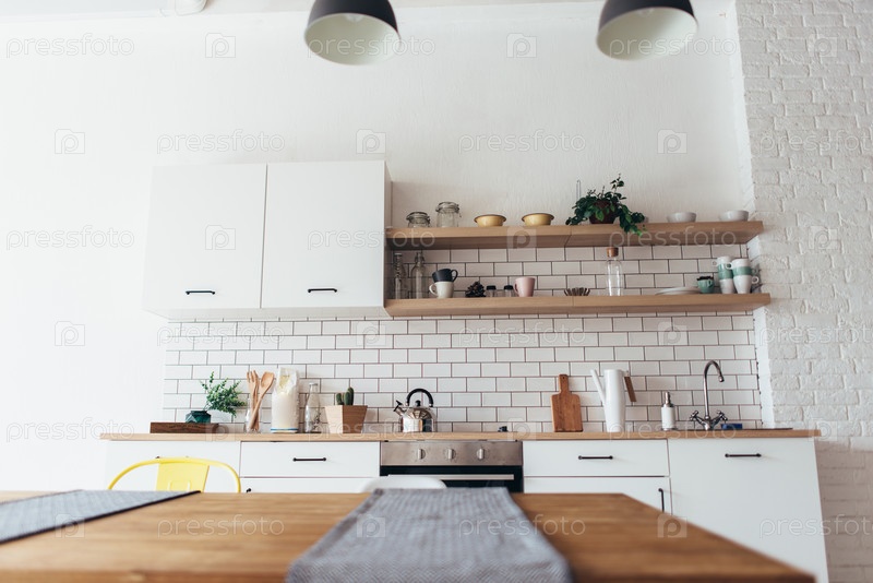 Современный новый светлый интерьер кухни с белой мебелью и обеденным столом